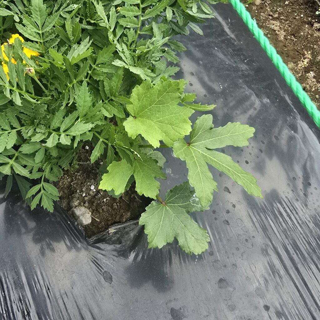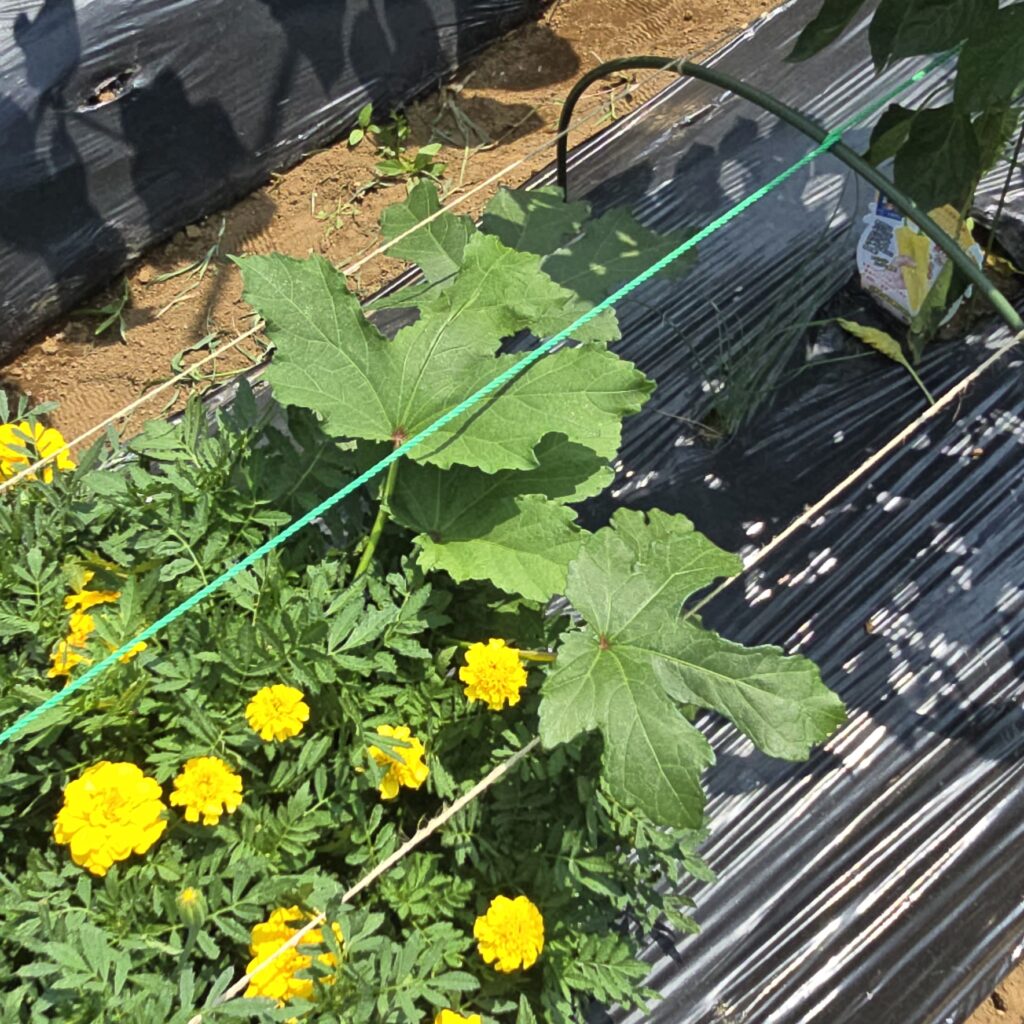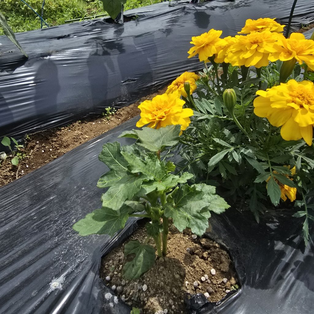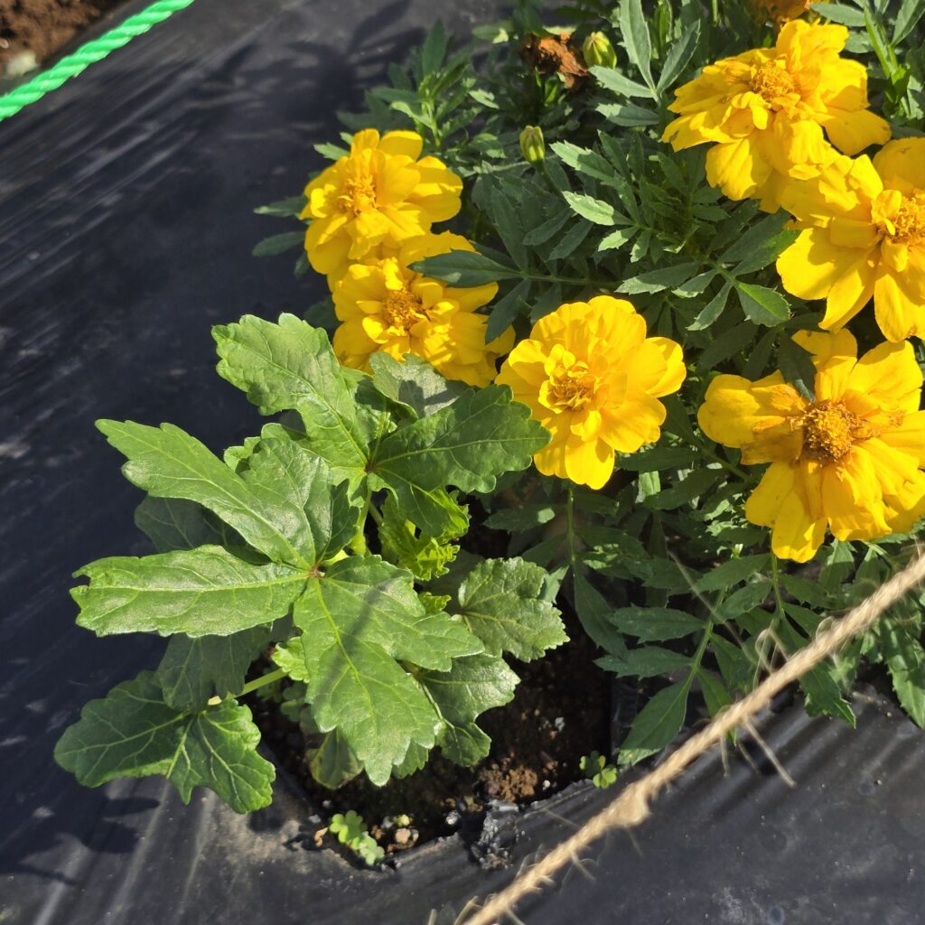 アブラムシ対策で種からのマリーゴールドの成長を待てないので2株チートで苗植え。マリ姉たちに支えられて育ちなさい。