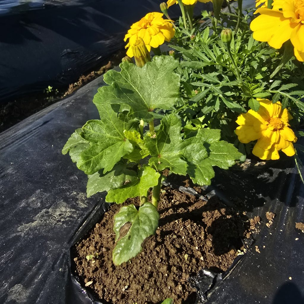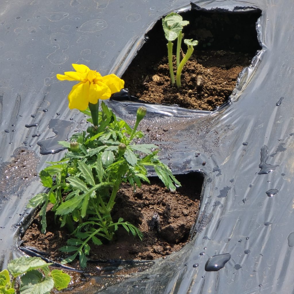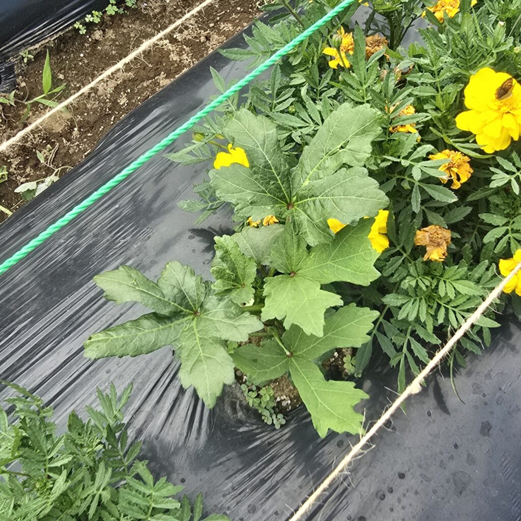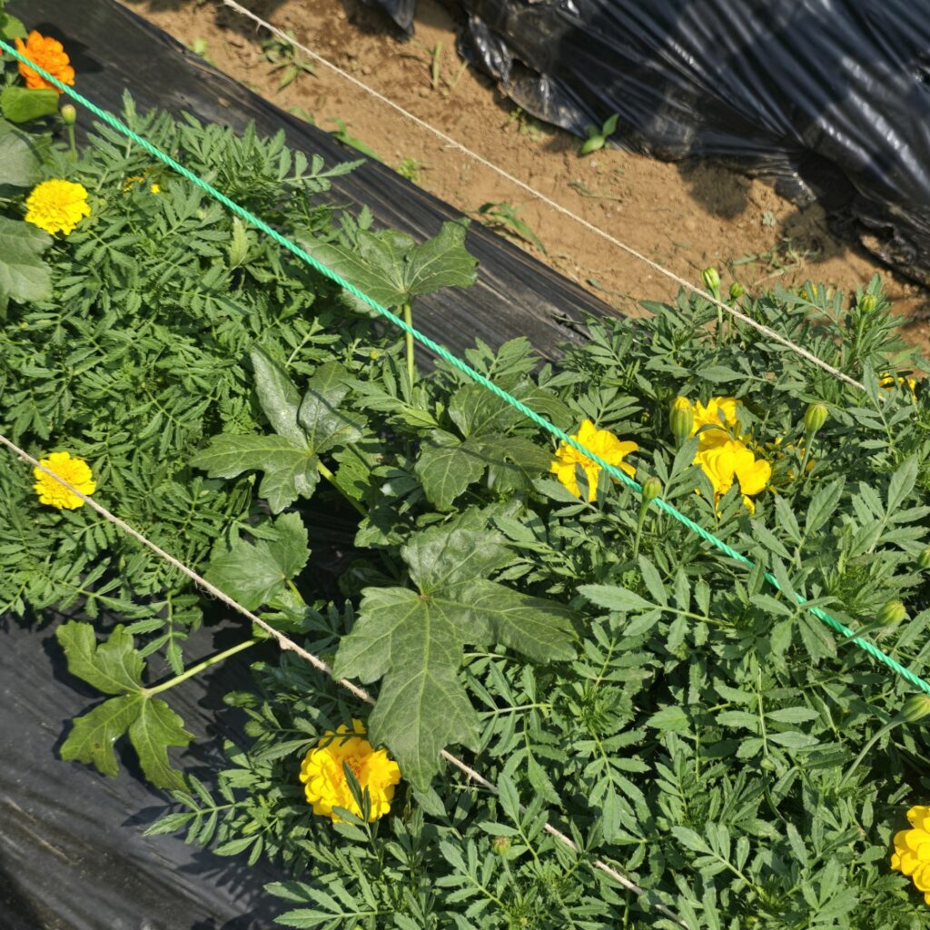 アブラムシ対策で種からのマリーゴールドの成長を待てないので2株チートで苗植え。マリ姉たちに支えられて育ちなさい。
