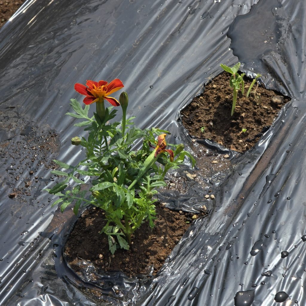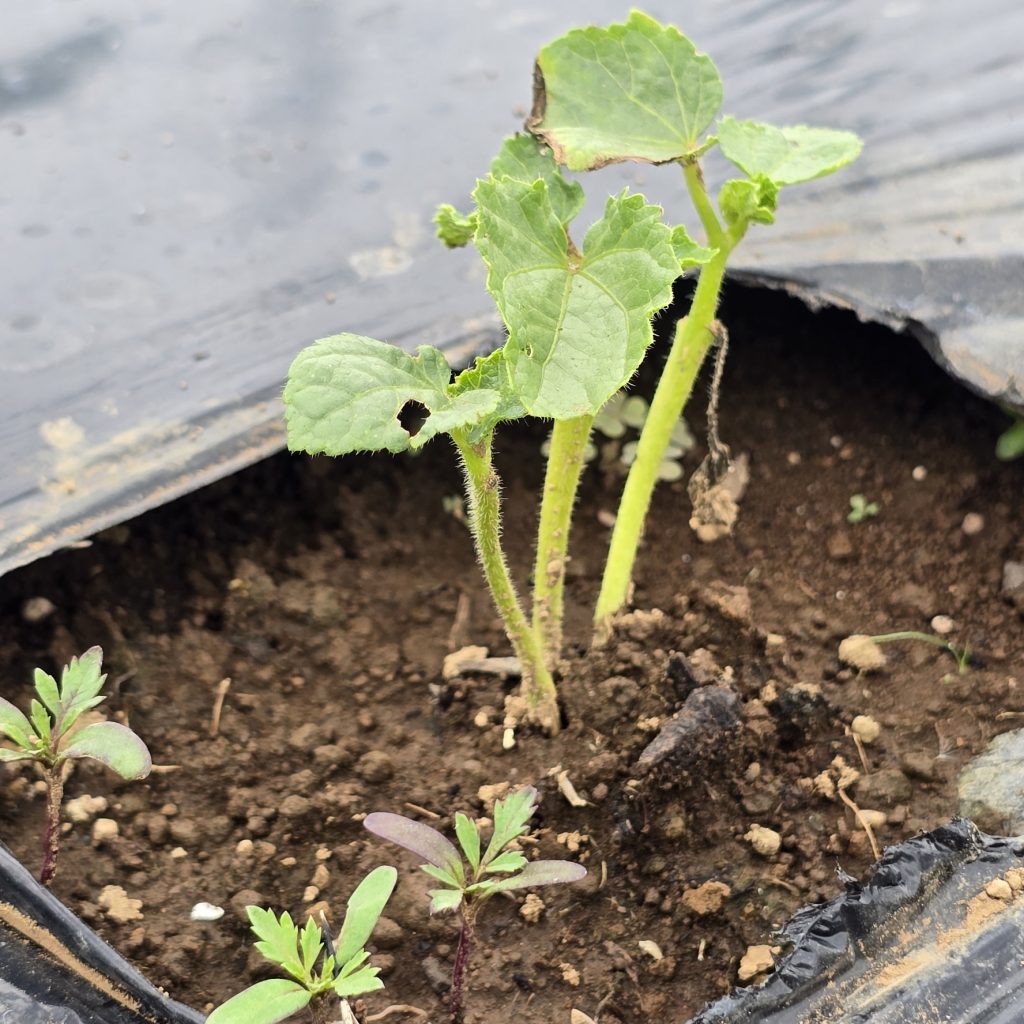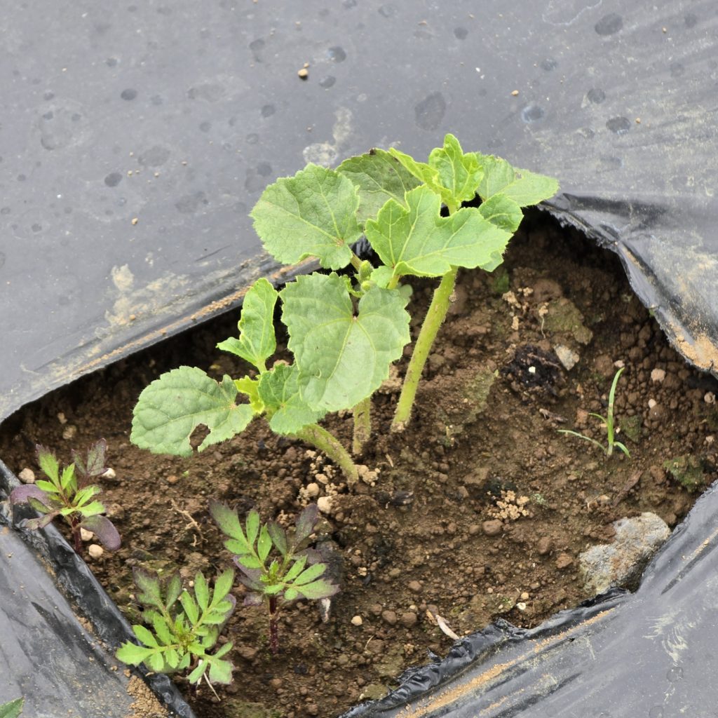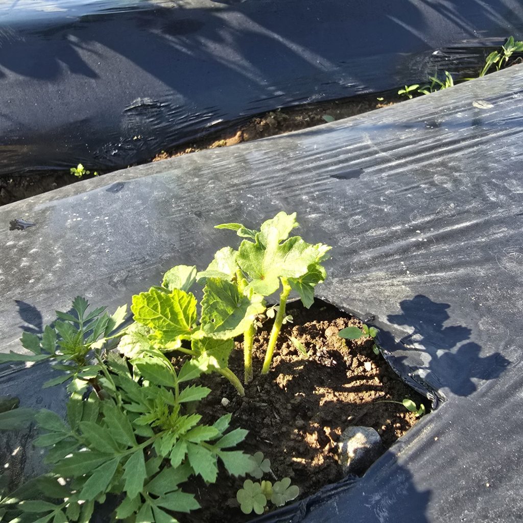 アブラムシ対策で種からのマリーゴールドの成長を待てないので2株チートで苗植え。マリ姉たちに支えられて育ちなさい。
